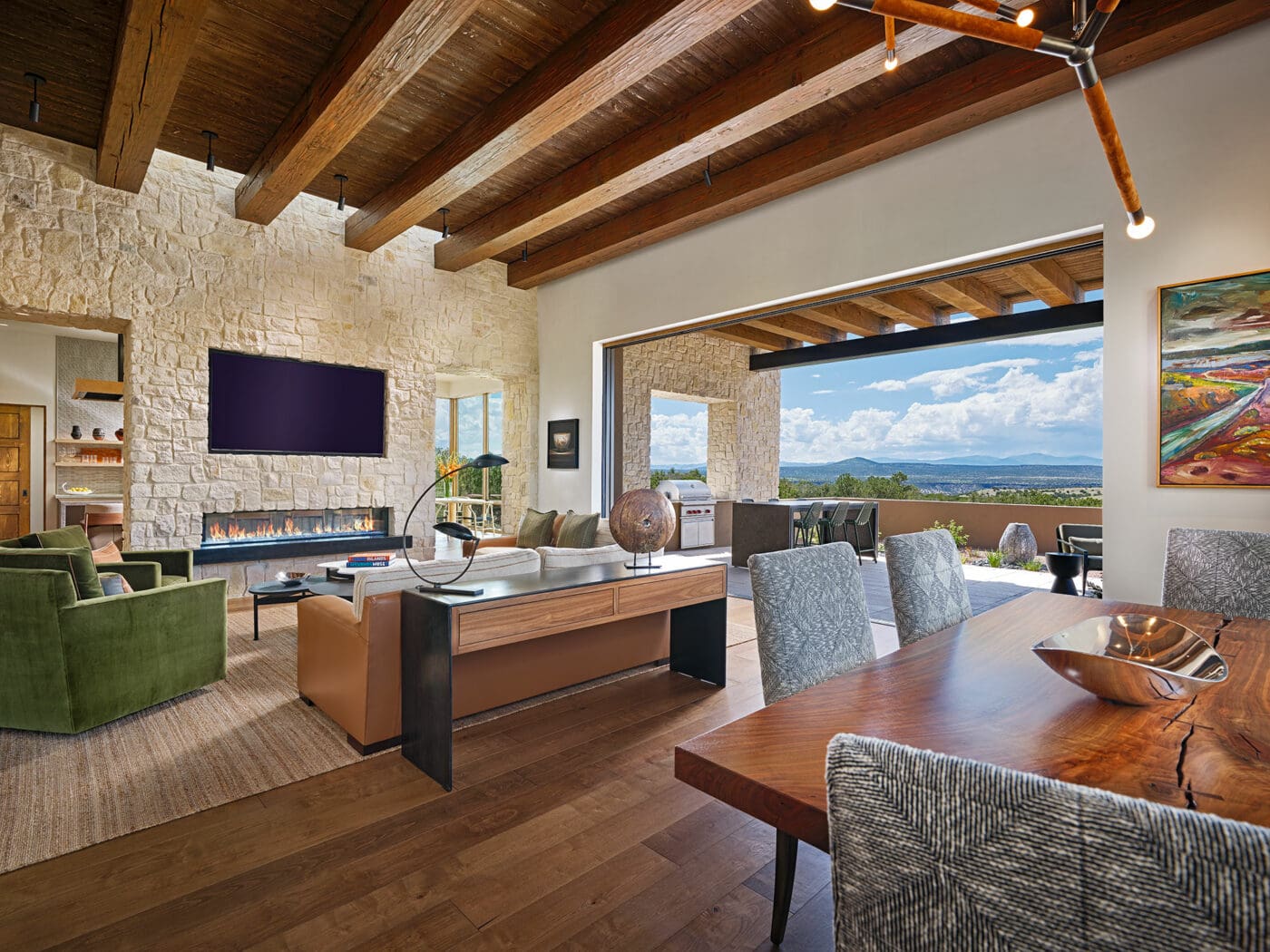 You walk in the entryway, which opens up, into a great room, which opens up into the great room fireplace on the left and dining area on the right. There are big floor to ceiling sliding window walls directly overlooking the portal, which has fantastic views out to the Jemez Mountains.
