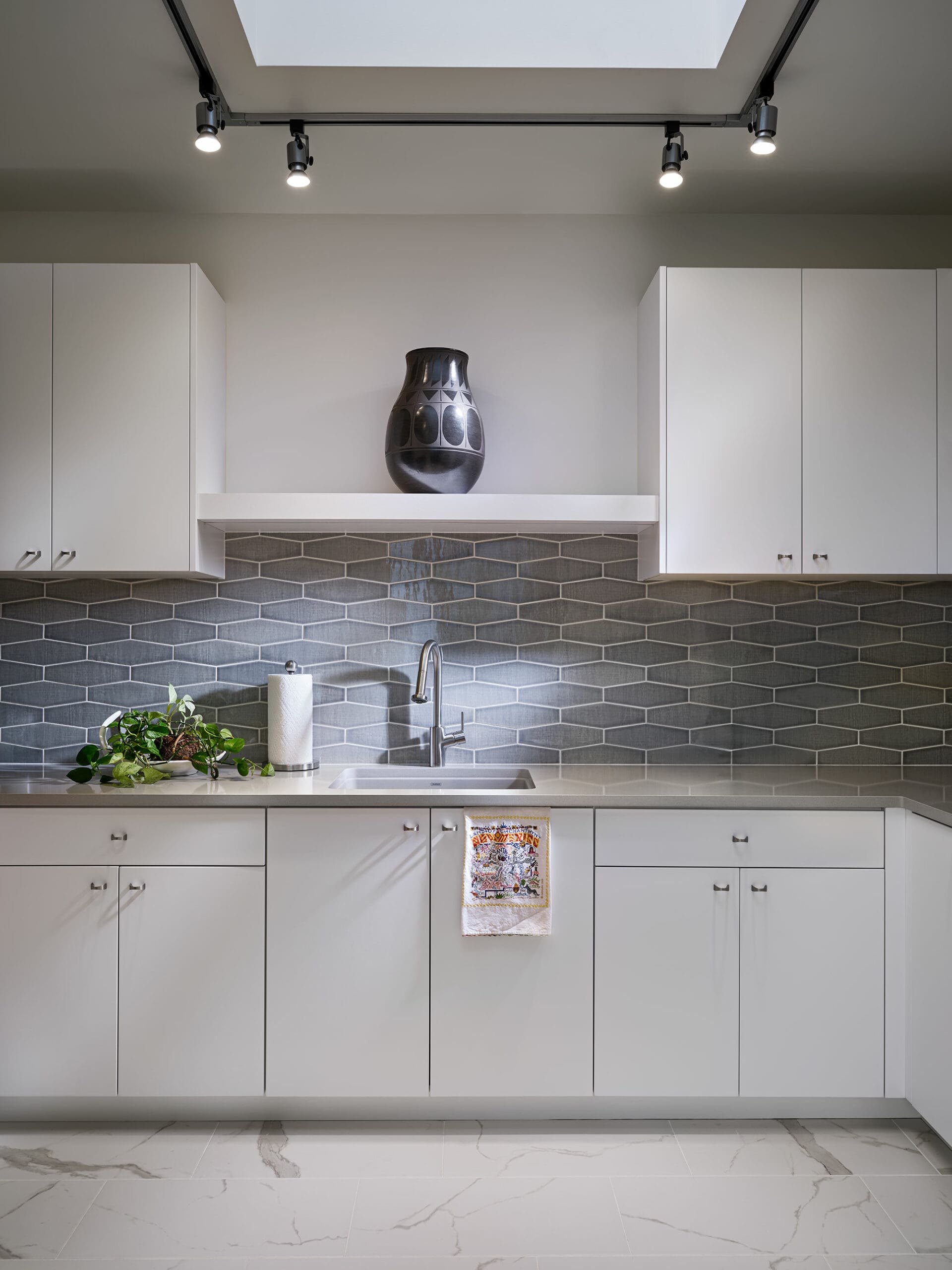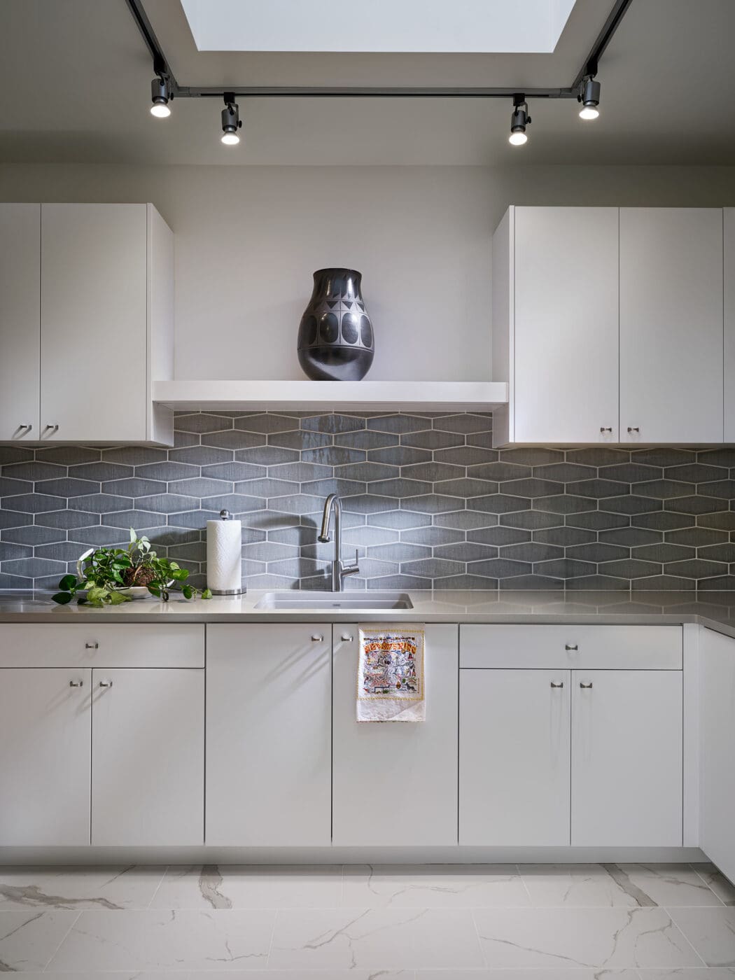 Cabinetry by HS Craftsmen, floating shelves that match the trim on the floating sculptural light fixture above the kitchen island.