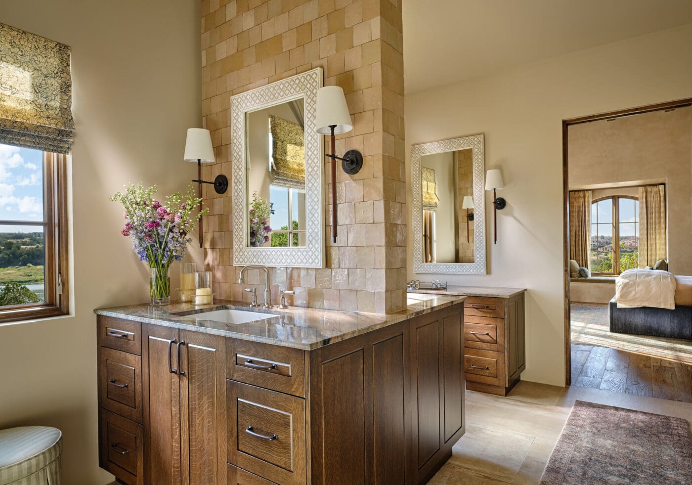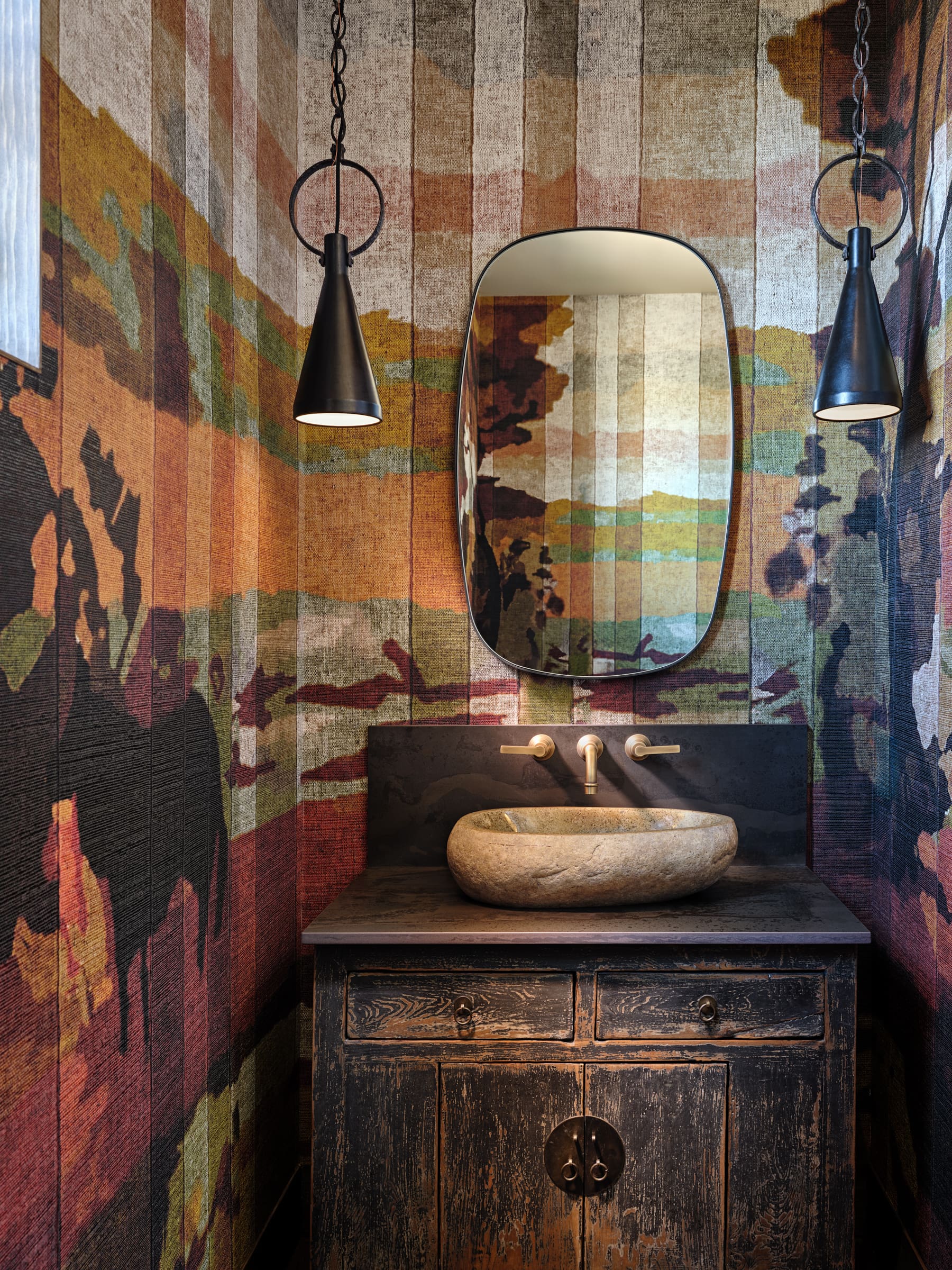 Emily Henry has created stunning spaces, such as the powder room, which is adorned with wall-to-wall, continuous image wallpaper. When you enter, you feel as if you are in a marvelous landscape.
