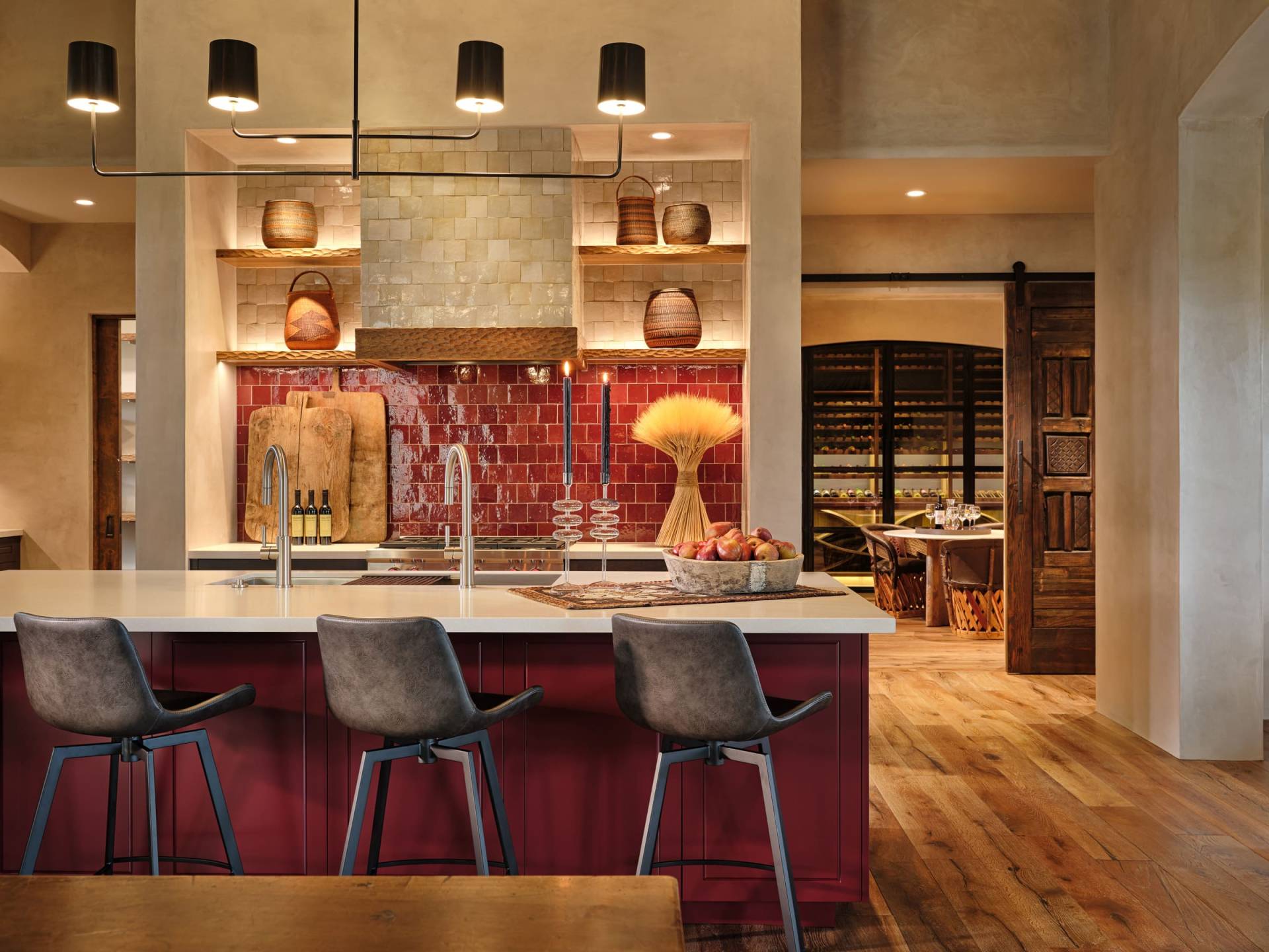 There is a unique wine room, with a vaulted, brick-clad vaulted ceiling, and a custom wine storage system behind glass doors.
